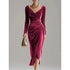 Long Sleeve Pleated Long Slit Velvet Sheath Dress